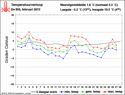 Vorig jaar februari bedroeg de gemiddelde temperatuur in De Bilt 0,8 °C, het aantal uren zonneschijn 113 en de neerslagsom 21 mm.