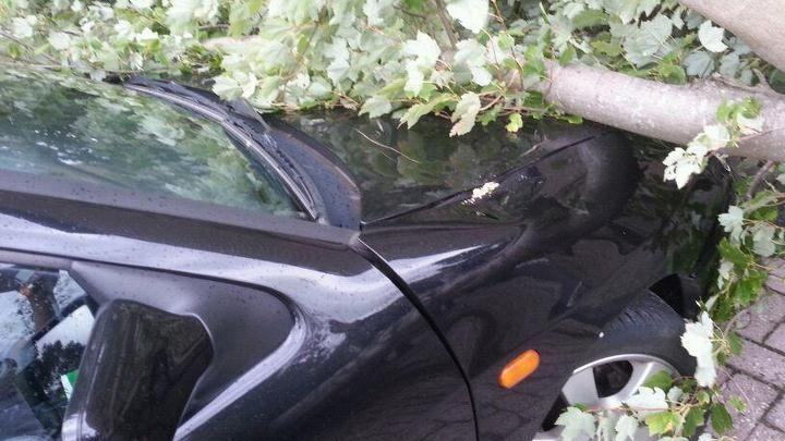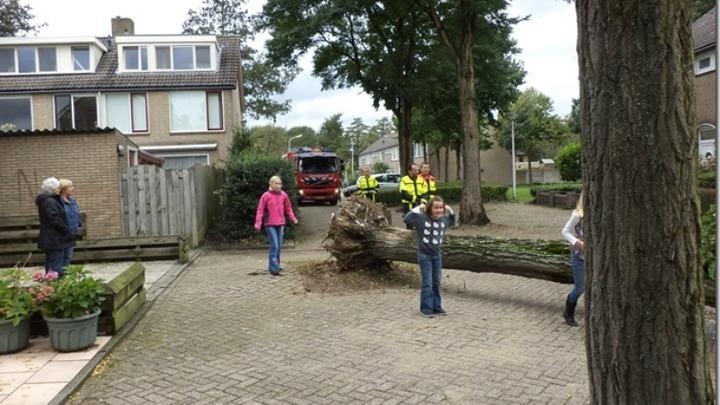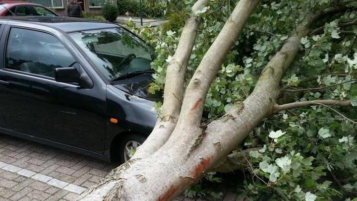 Er is de afgelopen 12 uur plaatselijk al veel regen gevallen, daar komt vanmiddag lokaal nog flink wat bij (50 mm). Op sommige plaatsen is de bodem zo drassig dat wortels van bomen losser komen te staan en een flinke windvlaag genoeg is om een boom te doen omwaaien. Foto: Corina Magielse
