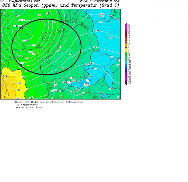De temp. op 850 hpa is amper onder nul, alleen in het oosten is de nul gradenlijn te vinden aan de grond ( oosten nederland en België). De rest varieert tussen 200m en zelf tot 1000 m op de kaarten.