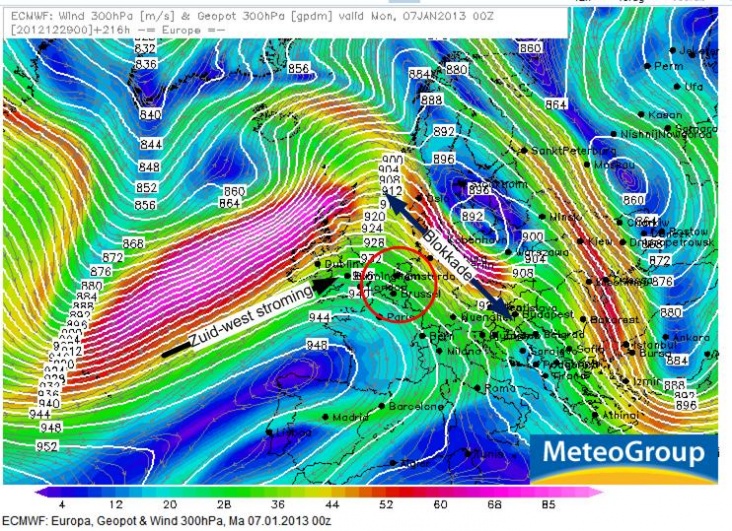 Gelijk maar even gekeken wat de jetstream doet zo rond de zevende.. en je kan hier dus zien dat we volgens deze run aan de verkeerde kant van de stroming belanden met als gevolg dat er een blokkade ontstaat en we te maken krijgen met een zuidwest aanvoer.. lange termijn maar zeer kenmerkend voor deze winter tot nu toe. ( mijn 8 graden trauma komt weer op