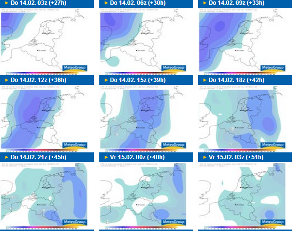 In het zuidoosten mogelijk nog lichte sneeuw of motsneeuw uit de Sc-velden, stelt weinig voor. De grootste aandacht gaat uit naar de neerslag van morgen. Zoals bij de modelbeoordeling al opgemerkt berekenen Hirlam en Harmonie al de eerste neerslag op het warmtefront op hoogte, tweede helft van de ochtend en eerste helft van de middag. We zien daarbij vooral in Hirlam een duidelijke smeltzone tussen de 3000-4500 vt, hetgeen met temperaturen aan de grond nog onder nul voor ijzel kan zorgen. EC laat dit vooralsnog niet zien, maar het blijft een punt dat zeer goed gemonitord moet worden. Op de neerslag in de tweede helft van de middag laten alle modellen sneeuw vallen, de smeltzone zal door doorvallende neerslag weer afkoelen tot rond of iets onder nul. De meeste neerslag wordt in de westelijke helft van het land verwacht, van groot belang voor de avondspits. De totale sneeuw accumulatie ligt in de ordegrootte 3-5 cm, plaatselijk mogelijk enkele cm's meer. In de oostelijke helft van het land valt donderdagavond en de nacht naar vrijdag over het algemeen 1-3 cm. Hirlam geeft nu ook voor de avonduren nog lichte neerslag, progtemps en NESO geven aan dat dit ook nog ijzel kan zijn, het opruimen van de koude plaklaag gaat nu duidelijk moeizamer dan in de vorige run.