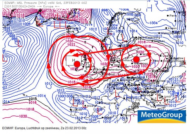 Een lagedrukgebied dat donderdag tussen IJsland en Schotland noordoostwaarts trekt vult vrijdag boven de Noorse Zee op. Een bijbehorend geoccludeerd frontaal systeem passeert ons land donderdagmiddag en avond, vrijdag overdag is de stroming westelijk en stroom er zachtere lucht ons land binnen. In het weekeinde vindt er boven onze omgeving weer opbouw van hogedruk plaats onder invloed van een zich ontwikkelende hoogterug boven de Britse Eilanden en het Noordzeegebied. Na het weekeinde blijft het hoog bij ons in de buurt, de exacte positie ervan is echter onzeker. De meest waarschijnlijke positie is ten noorden of ten noordoosten van ons land, in dit geval krijgen we te maken een terugkeer van het droge, maar vrij koude weertype. Andere mogelijkheden zijn dat het hoog ten oosten, zuiden of westen van ons land komt te liggen, in deze gevallen is er weinig verandering in temperatuur of wordt het zelfs nog wat zachter.