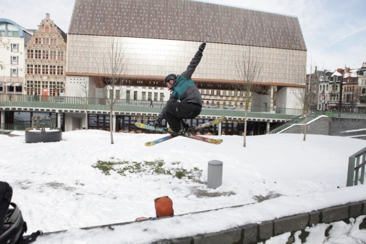 Sneeuw is niet alleen miserie, maar kan ook dikke pret zijn. Zo bewezen enkele enthousiaste wintersportfans dinsdagmiddag in het centrum van Gent. Enkele vrienden bouwden een bescheiden sneeuwschans aan het parkje aan de stadshal, bonden de skilatten aan en sprongen met de nodige snelheid uit de Cataloniëstraat het parkje in. 'We wilden dit al lang eens doen. Maar vandaag lag er eindelijk genoeg sneeuw', zegt skiër Reiner Cremers.