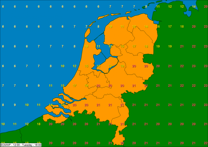 Afgaand op de weermodellen bevindt zich dinsdag een onstabiele en enigszins koele lucht boven Nederland, meldt Weerplaza. Op Koninginnedag is er kans op een enkele bui, is te lezen op de website van Weeronline. Er zijn veel stapelwolken met af en toe ook zon. Er staat niet veel wind, maar echt warm wordt het niet. Waarschijnlijk moeten we in de hoofdstad genoegen nemen met 12 graden. Weerplaza verwacht temperaturen iets onder normale waarden voor eind april. Het wordt dinsdag 10 tot 15 graden. Normaal is het zo'n 14 graden in het noordwesten en 17 in het zuidoosten.
