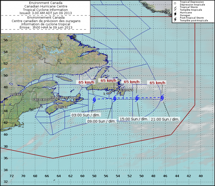Post-tropische storm Andrea lag om 3.30 AM NDT op 440 km ten west-zuidwesten van st. Johns. De gemiddelde windsnelheid bedroeg 65 km/h. Het systeem trekt naar het oosten met een snelheid van 55 km/h. De druk bedraagt 1003 mb.