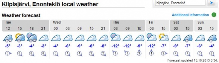 In het noordwesten van Fins-Lapland is het weer omgeslagen. De temperatuur was in Kilpisjärvi gisteren overdag nog +5 graden, vannacht om 03u plaatselijke tijd ging het sneeuwen bij temperaturen verder dalend onder nul. De verwachting is dat de temperatuur nog verder daalt waarbij het donderdag tot strenge vorst komt en zelfs overdag maar net iets warmer dan strenge vorst (-9). Lapland duikt dus de winter in met vandaag de 1e ijsdag!