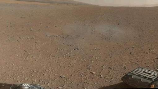Op de foto – bij Nasa spreken ze over het ‘plaats delict’- zijn rond de hardware donkere vlekken te zien. Die zijn veroorzaakt door de inslag; fijn en gebleekt stof werd opgedwarreld waardoor donkerdere grondlagen vrij kwamen te liggen. Vooral rond Curiosity zelf is dat goed te zien. Die extra donkere vlek is het gevolg van de remraketten. Na de landing vlogen die los van Curiosity verder en kwamen een paar kilometer verderop neer.