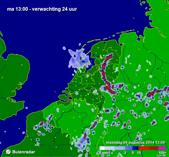 Heb jouw voorbeeld er even eruit gepakt. Maar je ziet dat er dus niets van overgebleven is. De voorspellingen die gedaan worden hebben soms een rekenkans van minder dan 10% en daar wordt een hele hoop aan vastgehangen. Lijkt mij dat er op het forum alleen uitgegaan moet worden van onweerskans als er meer dan 50% kans is. Dan ben je als O-O geloofwaardiger en trefzekerder dan wat er nu gebeurd. Begrijp me goed, ik kijk hier graag hoor. Maar er is ook een hele hoop Onzin-Online wat het forum en deze site niet ten goede komt. Vaak ben ik dan ook snel weer weg en laat het maar voor wat het is. Dit is niet kwaad bedoeld maar een opsteker voor de moderators. Hou het simpel, duidelijk en trefzeker. Nogmaals, geen commentaar naar jou.