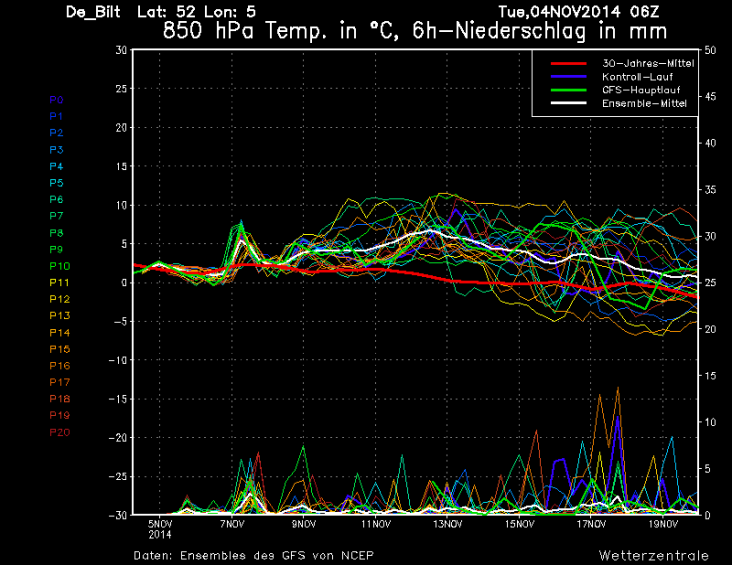 In onderstaande afbeelding zie je de temperatuurverwachting van verschillende leden op ongeveer 1500m hoogte. Na 14 november wordt de spreiding tussen de leden erg groot. Wie weet.. Begin december winter? Het zou zo maar kunnen!