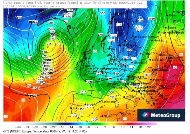 Nieuwigheidje is overigens wel dat dit volgens mij de eerste 850hPa kaart van het seizoen is waarbij de temperatuur onder nul is boven de Benelux.