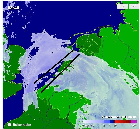 Uitgaande van de positie waar het laagje zich bevond bij Ierland, kun je een lijn tekenen hoe zuidelijk de kern trekt, en als dat op deze voet door zou gaan, dan zou het laagje uitkomen in ongeveer centraal-België, eigenlijk wat al langer voorspeld was. Dit lijkt echter wel erg gunstig te zijn voor de sneeuw ten noorden van de kern, voor het zuiden iets minder goed nieuws.