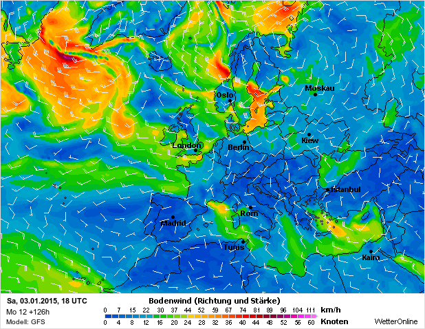 GFS-GSM komt met een 10bft op LT zaterdag 3 Januari..