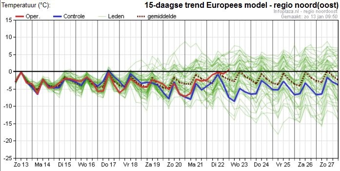 Reacties zoals 'De afgelopen tijd hebben we alle modellen in de prullebak kunnen gooien' slaan natuurlijk nergens op, kijk alleen al naar zo'n simpele pluim en daarin kun je zien dat het totaal niet zeker is dat we een langdurige westcirculatie te pakken hebben maar dat het simpelweg niet te voorspellen is zo ver van te voren en dat je Koning Winter in deze tijd van het jaar zeker niet mag afschrijven. Koning Winter zal zichzelf nooit ver van te voren gaan aankondigen maar juist heel plotseling, mede omdat winterweer voor Nederland voorspellen heel lastig is door de Noordzee en de warme Atlantische Oceaan.