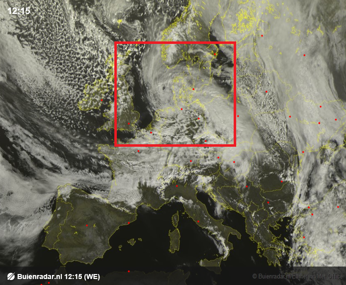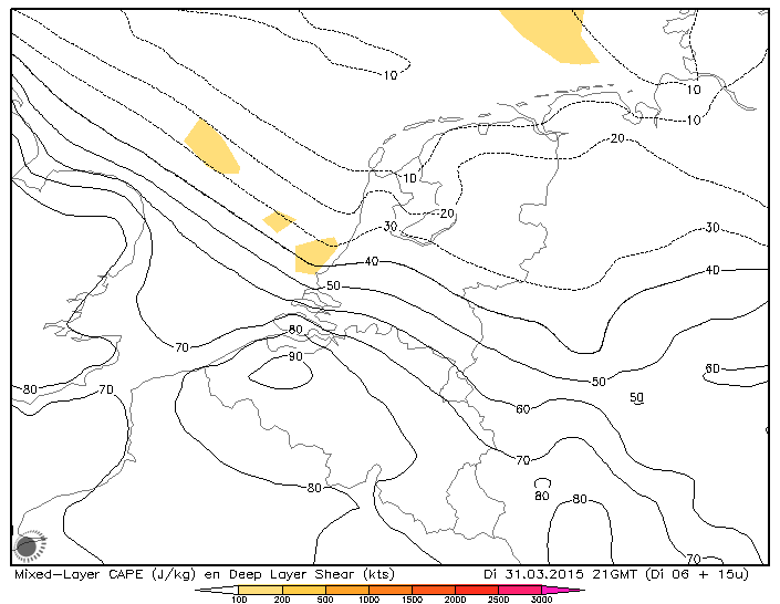 Geleidelijk steeds meer Cb's, toppen tot ca. FL200. Vanmiddag en vanavond wordt de bovenlucht kouder en worden de Cb's talrijker. De CAPE is dan ca. 200-400 J/kg en de schering 0-6 km ca. 50 kn, in het zuidwesten zelfs ca. 60 kn. Organisatiegraad is single cel/multicel en mogelijk zelfs enkele mini-supercells.