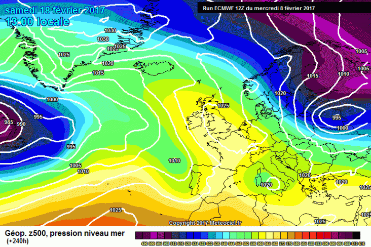 En dan is er ook nog de mogelijkheid dat er eind volgende week door vorming hogedruk bij Groenland bij ons een koude noordelijke aanvoer gaat ontstaan. Onderstaande kaart laat de vorming hiervan zien. Hogedruk ten oosten gaat boven onze omgeving een verbinding aan met hogedruk ten westen en uiteindelijk komt de kern dan ten noordwesten.