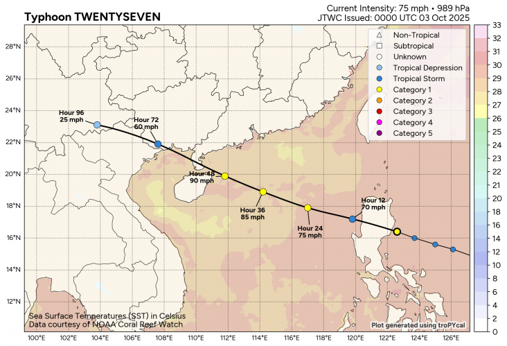 De komende dagen trekt Ragasa als max. categorie 1 langs de Zuid-Chinese kust richting het noorden van Vietnam. Daar kunnen zware tropische buien gaan vallen.