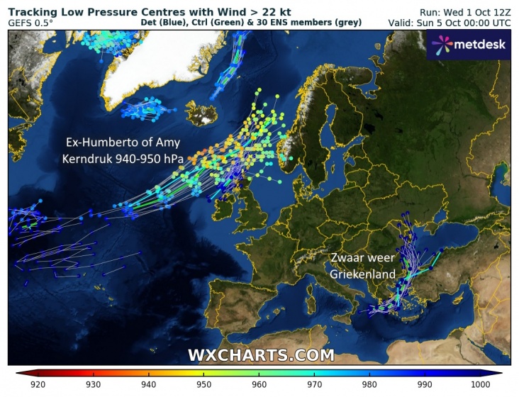 De kans op storm in Nederland is de laatste runs wat afgenomen, want de koers blijft wat noordelijker. Schotland en mogelijk later nog Noorwegen lijken wel de volle laag te krijgen. Ex-Humberto wordt herboren als Amy, de luchtdruk daalt explosief en een groot windveld ontstaat. De luchtdruk in de kern kan dalen tot 940~960 hPa, enkele berekeningen komen zelfs tot 935 of 930 hPa.