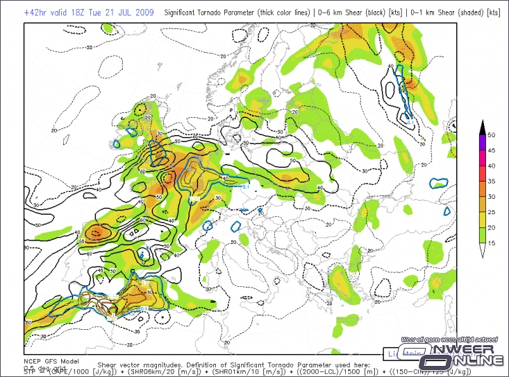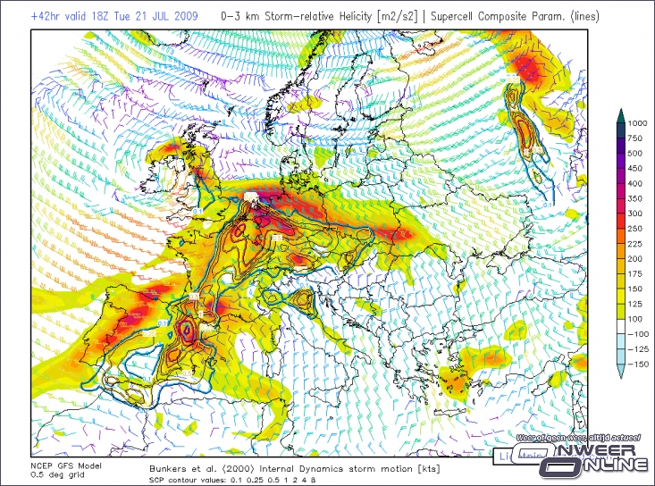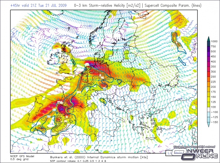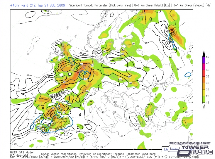Wat de windshear betreft is deze wel in voldoende mate aanwezig in het gebied met WAA (per definitie een gebied met shear). De hoogste shear vinden we net na het WF maar daar is de onstabiliteit uiteraard beperkt. Wat verder naar het zuiden toe (richting Ardennen) neemt de shear (en storm-relatieve (SR) shear/helicity) af maar de onstabiliteit toe. Ergens daar tussenin bevindt zich een overlappingsgebied met SB-EHI waarden rond 2. Ook indexen zoals STP en SCP slaan hoog uit maar dit mijns inziens vooral door het hoge aandeel van de SRH, en minder door de onstabiliteit. We moeten dus voorzichtig zijn bij de interpretatie van deze kaarten.