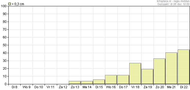 Dinsdag zou er een beetje sneeuw kunnen gaan vallen en komt er een matige oostenwind te staan. De temperatuur zal dan waarschijnlijk nergens meer boven het vriespunt uitkomen.Er volgt dan een nacht met lichte tot matige vorst.
