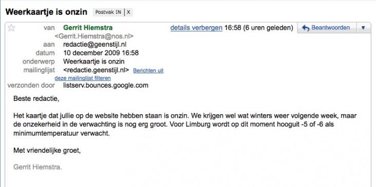 Ooja. Gerrit -chemtrail- Hiemstra in de mail. De weerman van het NOS Journaal tikt GeenStijl even snoeihard op de vingers wegens het verkondigen van meteo peopverhalen. Hiemstra, ooit door de Nederlandse volksschrijver Gerard Reve treffend omschreven als "de man van het wederbericht" trekt onze berichtgeving inzake de kleine ijstijd van volgende week ernstig in twijfel. Volgens Hiemstra is het door ons getoonde meteokaartje "onzin" en gaat het in Limburg hooguit -5 tot -6 vriezen. Check de Gerrit METEOMAIL. Waarin hij eigenlijk 'weerstrateeg' Marc Putto Powned. Volgende week weten we het zeker...