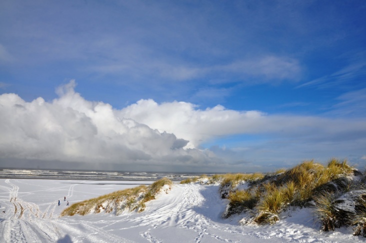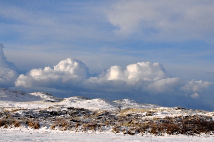 Een fraai winters landschap hier op Terschelling, sneeuw zon en prachtige cumulonimbus wolken
