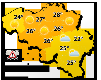 Zondag hangt er nog veel bewolking van het centrum tot de Ardennen. Geleidelijk krijgen we meer zon, en 's namiddags en 's avonds wordt het overal zonnig, met op veel plaatsen maxima boven 25 graden.