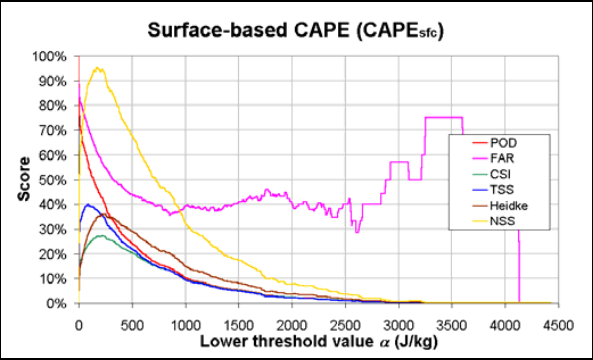 Meer van hetzelfde. De roze False Alarm lijn laat zien dat zelfs bij een Cape van 1500-2500 er in 40% van de gevallen geen onweer kwam.