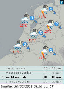 Klopt hoorde net P.P Zei ook moet nog zien dat de buien het noorden bereiken.. Wel veel neerslag mogelijk tot 10 mm.. dan reken ik nog wel op het onstaan van een losse onweersbui.. het warmt hier nl. al flink op de dag begon al wolkenloos met zonovergoten en temp. heb ik hier reeds 21,5 gr. Zo ga nu ff verder met metselen het nog mooi schaduw daar.. hoop er 2500 te vermetselen..