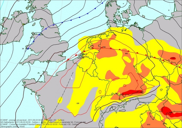 Korte samenvatting: In de middag neemt vanuit het zuiden uit de kans op enkele stevige regen en onweersbuien toe. De oorzaak van die enkele stevige regen en onweersbuien is een thermisch laagje dat vanuit Frankrijk richting het noorden trekt. Lokaal kan er veel neerslag gaan vallen. | Gewijzigd: 3 juni 2011, 15:45 uur, door Verwijderde_gebruiker_01