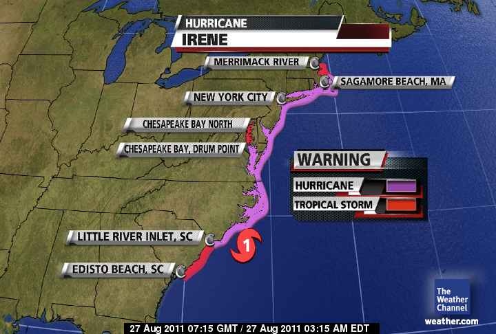 De verwachting is dat Irene over de dichtbevolkte Amerikaanse oostkust naar het noorden trekt. Van North Carolina tot de noordelijke staat Massachussetts is een orkaanalarm van kracht. Reservisten zijn opgeroepen en lokale overheden stelden noodprocedures in werking. Zij hebben 2,3 miljoen mensen in het gebied op het hart gebonden tijdelijk elders een veilig heenkomen te zoeken.