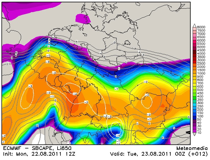 Uitgaande van alleen de CAPE-LI ziet het er volgens EC12 als volgt uit. UKMO komt daarmee aardig overeen.