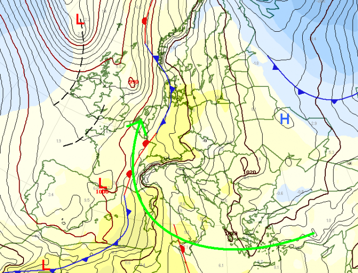 Rondom datzelfde hogedrukgebied boven Rusland wordt bij ons juist warme lucht vanuit het zuiden aangevoerd.
