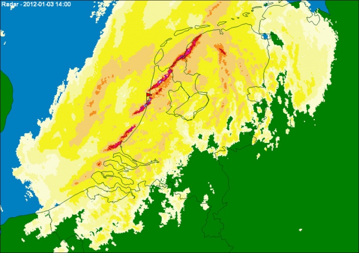 'Een koufront, gemarkeerd door een zogenaamde 'squalline', trok dinsdagmiddag in razend tempo van boven de Noordzee over ons land. Aan de westkust ging de passage van de squalline gepaard met een snelle en extreme schommeling in het waterpeil. De pijl op de kaart markeert IJmuiden. Tijdstip van het radarbeeld: exact 15.00 uur Nederlandse tijd (14.00 uur UTC).
