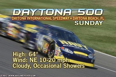 Door regen zal de start van de Daytona 500 worden uitgesteld en mogelijk zelfs worden afgelast. Een zwak, maar zeer vochtig storm systeem vanuit de golf van Mexico spreidt zich uit over het noorden van Florida. Terwijl de zwaarste regenval ten noorden van Daytona Beach wordt verwacht, zal de neerslag een probleem gaan vormen voor de toestand van het asfalt. Ook voor morgen (maandag) worden er fikse regenbuien verwacht.