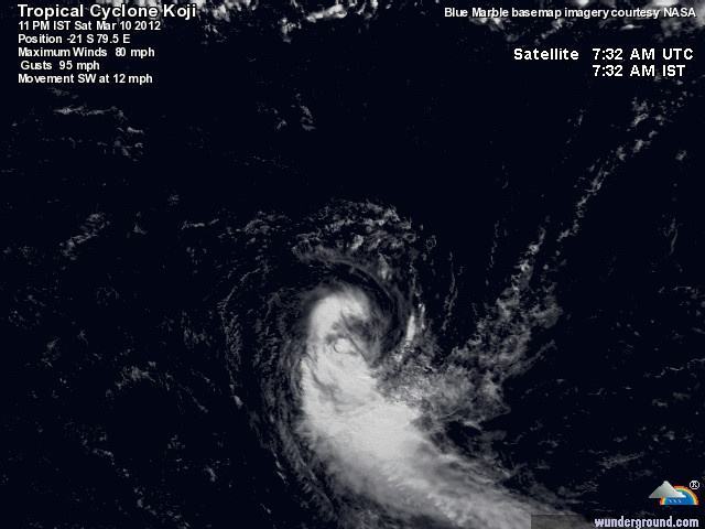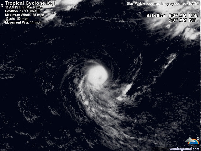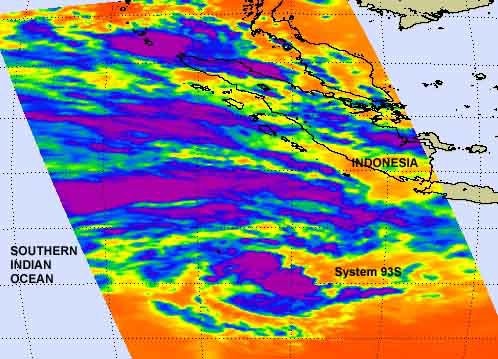 In het zuidoosten van de Indische Oceaan bestaat er de mogelijkheid, dat 93S zich gaat ontwikkelen tot een tropische depressie. Het lage druk gebied is een brede band en ligt gecentreerd nabij 12.5Z en 99.6O, ongeveer 160 zeemijlen ten oost-zuidoosten van Cocos Island, Australië. Op het onderstaande infra-rood beeld zijn de banden met onweersbuien (blauwe en paarse strepen) goed zichtbaar. Het systeem is enigszins georganiseerd. Het systeem trekt richting het west-zuidwesten. De warme zee-oppervlakte temperaturen zijn gunstig voor verdere ontwikkeling. Het systeem heeft een gemiddelde kans om een depressie te worden.