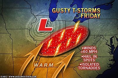 Lokaal kunnen er vandaag in de Ohia vallei zware onweersbuien voorkomen. De stormen met hagel hebben reeds al voor overlast gezorgd tijdens de ochtendspits. De onweersbuien zullen in de loop van de middag intensiveren langs het kou front als deze in botsing komt met warme en vochtige lucht. De mogelijkheid bestaat, dat de buien zich vormen tot een zogenaamde squall line. Deze squall line zal zich uitstrekken van het noordwesten tot het zuidoosten. Het grootste risico op zwaar weer loopt het gebied vanaf Indiana en het westen van Kentuky richtning het oosten tot in Ohia en delen van het westen van Virginia. In dit gebied liggen steden zoals Louisville, Cinicinnati en Columbus. Een paar zware buien zullen het zuiden van Michigan, het zuidwesten van Ontario en het Erie Lake kustgebied schampen. Met zeer koude lucht langszij zal de hagel (golfballen of groter) het grootste probleem opleveren. Windstoten van 96 km/h of meer kunnen schade opleveren aan o.a. bomen. Tevens moet er rekening gehouden worden met stroomuitval. De kans op tornado's is minimaal, echter is deze kans niet nihil.