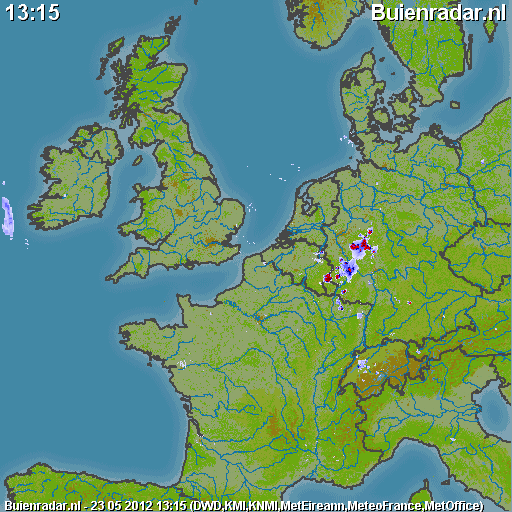 Hoewel, multicell, het lijkt meer op een groepje single cells. Wel mooi om te zien dat de outflow van de eerste bui ten westen, noorden en oosten van de bui voor nieuwe cellen zorgt. | Gewijzigd: 23 mei 2012, 13:21 uur, door Robert96