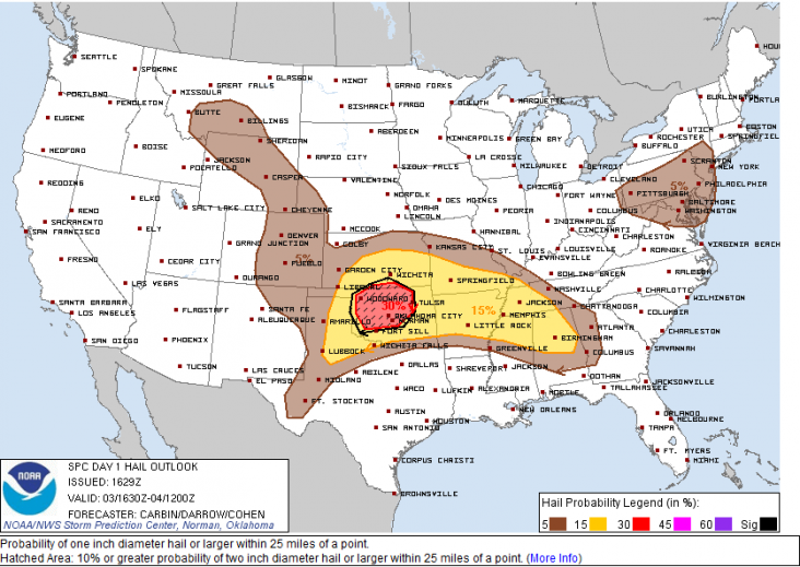 Van Oklahoma tot Missouri en vanaf Arkansas richting het oosten bestaat er een risico op zware tot zeer zware onweerbuien. In Oklahoma bestaat er de kans op grote hagelstenen (golfballen) en destructieve storm tot zeker 112 km/h. Dit komt doordat een korte golf trog (van lagedruk) Oklahoma vanuit het westen nadert.