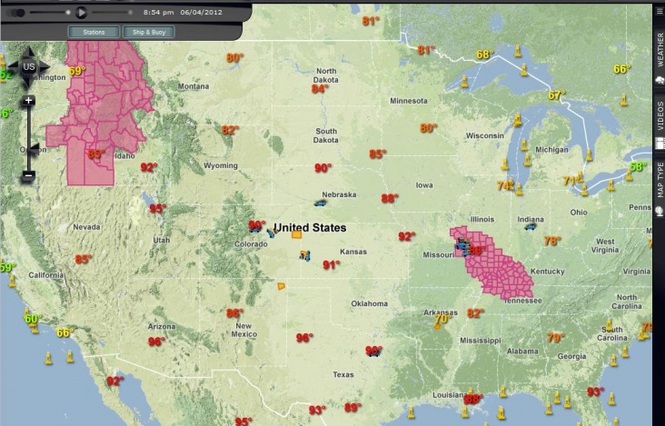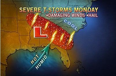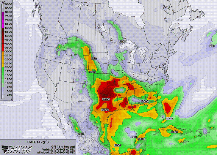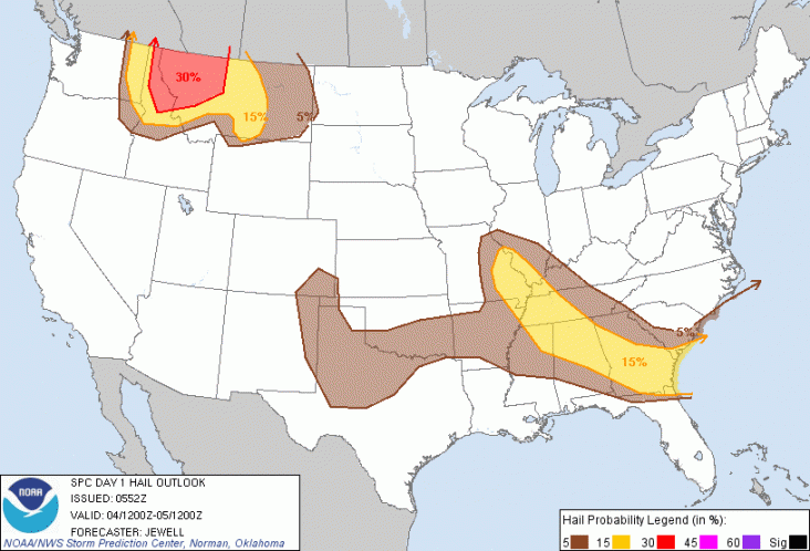 Vanmiddag en vanavond vormen zich op een aantal plaatsen in de VS zware buien, die in het Zuid Zuid-Oosten gepaard kunnen gaan met zwaar onweer, hagel en zware windstoten tot 100 km/h. In het Noord-Westen van de VS ontstaan ook zware buien, die gepaard kunnen gaan met extreme hagelbuien en windstoten tot 100 km/h. In dit gebied is de kans op één of meerdere tornado niet uitgesloten.