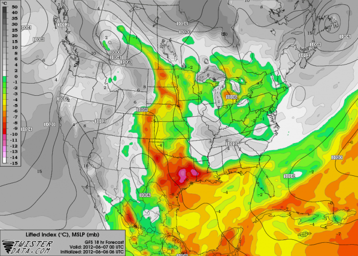 Delen van Colorado, Wyoming, Nebraska en Kansas zullen door zware buien later op de dag en in vanavond getroffen worden. Een koufront bots op de aanwezige warme en vochtige lucht, die van uit het Zuiden wordt aangevoerd. De buien kunnen gepaard gaan met zware windstoten en hagelstenen zo groot als golfballen. Voor vandaag is er een slight risk op tornado's in die omgeving tot 5%.