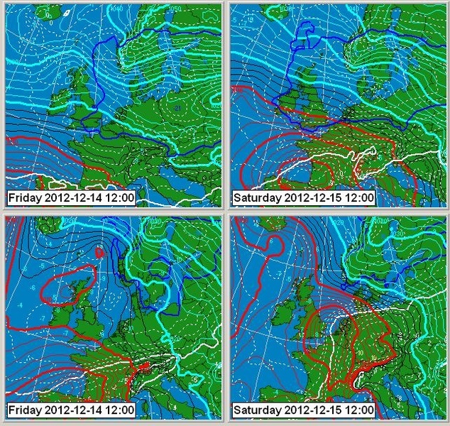 Ook voor volgende week een onzekere verwachting. Meest matige vorst met een stevige oostzuidoostenwind (bovenste kaarten), of een Spaanse depressie die dooi gaat brengen (onderste kaarten)?