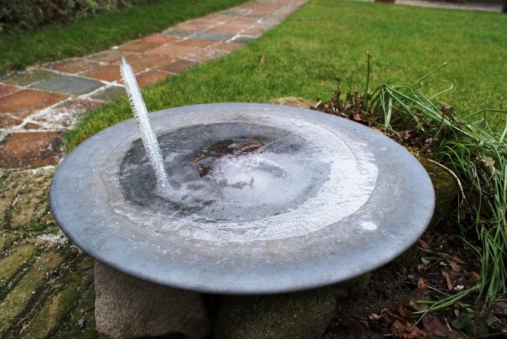 Ook afgelopen week is er weer een foto van een ijspegel naar ons opgestuurd (waarnemingen_at_weer.nl). Ingrid Nutterden was verbaasd toen zijn in haar bevroren vogelbadje een vele centimeters hoge pegel zag staan. In eerste instantie is dat ook een vreemd gezicht. Immers, de puntige staaf ijs rijst tegen de zwaartekracht in en er is geen vorm (malletje) gebruikt om ‘m er zo fraai uit te laten zien. De afgelopen jaren hebben we tijdens winterse perioden geregeld een stalagmiet van ijs in onze mailboxen ontvangen. Ze variëren van klein tot groot, van bijna rechtop staand tot vrij schuin wijzend en van in een volledig bevroren bak staand tot in een bak waar onderin het water nog net in de vloeibare vorm aanwezig is. In alle gevallen ziet het er mooi en wonderbaarlijk uit. En gelukkig is er een logica die deze pegels verklaard. Het is geen mysterie….