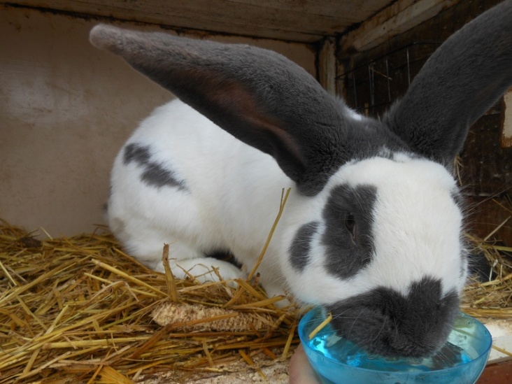 Ook voor dieren is het winterweer vaak geen pretje. Bij dit konijn bevriest steeds zijn drinkflesje. Hij krijgt daarom een paar keer per dag een vers bakje water. Foto: Gerard Kiewiet.