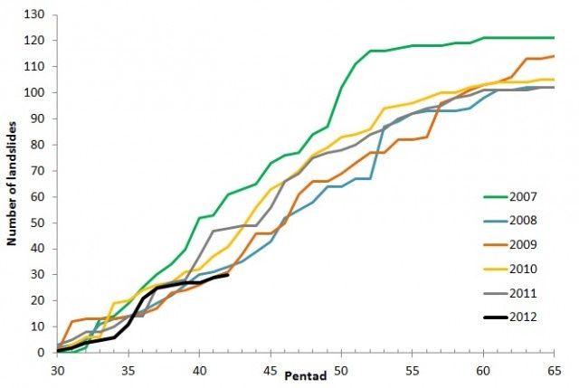 Het "epicentrum" voor dodelijke landverschuivingen ligt in het zuiden van Azië en in het bijzonder aan de zuidelijke rand van de Himalaya. De belangrijkste factor is de zomer moesson, die aanhoudende regenval brengt naar de regio. De moesson start normaliter aan het einde van de maand mij. De onderstaande grafiek toont het cumulatieve aantal dodelijke landverschuivingen in Zuid Azië over de afgelopen paar jaar. Op de x-as staat de tijd. Eén pentad staat voor 5 dagen. De grafiek loopt van Pentad 30 (i.e. 31 mei, dag 151) tot pentad 65 en beslaat de hele moessonperiode.