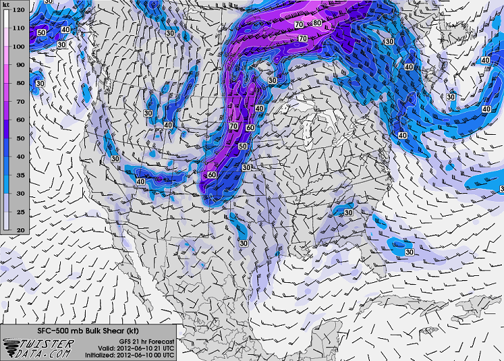 Vandaag trekt er in de loop van de middag en begin van de avond een koufront van West naar Oost en komt over een lijn van Minnesota tot Oklahoma in botsing met de warme lucht daar. Over de hele lijn en met name de Noord kant ontstaan zware buien die gepaard kunnen gaan met windstoten to 120 km/h en hagelstenen met een grootte van golfballen. In de staat Minnesota is de kans op een of meerdere tornado's het grootst. In het Zuiden aan de kust bevind zich ook een gebied met een relatief kleine kans op een enkele tornado (zie SPC kaart).