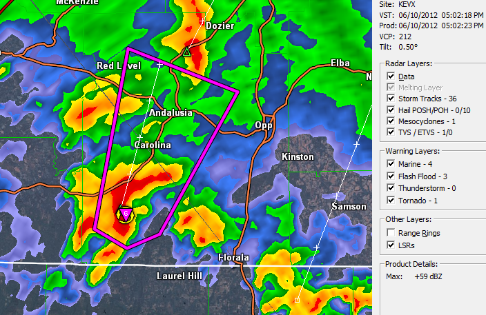 Onderzoek heeft aangetoond, dat het om een EF1 tornado ging in GenèvaCounty (Alabama). De National Weather Service in Tallahassee, Florida heeft dit verklaart aan de hand van ooggetuige-verslagen, foto's,video, radargegevens en aan de hand van schade zijn ze tot deze rating gekomen. Aangenomen wordt, dat het pad van deze tornado bijna continu was. De tornado kwam aan de grond in de buurt van Niva Drive-In Road snelweg en verdween weer net ten oosten van kanselier Geneva County. Het grootste deel van de schade was in de EF0 status. Echter, de meest significante schade lijkt te hebben plaatsgevonden in de buurt van County road 99 en Buck Vaughn Road. Schade in deze buurt van deze locatie is in overeenstemming met EF1.