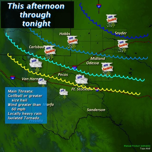 Geïsoleerde onweersbuien, sommige zwaar, zullen deze middag (lokale tijd) over grote delen van het westen van Texas en het zuidoosten van New Mexico trekken. Er bestaat een kans op hagel zo groot als golfballen of zelfs groter. De windsnelheden kunnen oplopen tot 96 km/h. Lokaal kan er wateroverlast voorkomen door de zware regenval. Een tornado bestaat ook tot de mogelijkheden.