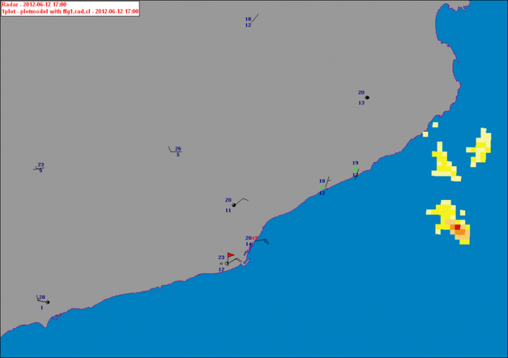 Om 18 uur lokale tijd (16 UTC) stond er nog een zuidwestenwind en was het 26 graden. Ver weg ten noordoosten van Barcelona (op circa 70 kilometer afstand) bevond zich een naar het oosten trekkende bui.
