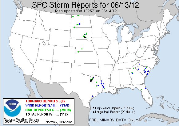 Er waren 79 verslagen van hagel in de Verenigde Staten op woensdag, waarvan vele rondom de Dallas regio. Van die verslagen waren 19 reports hagel groter dan 2 "inch in diameter, ongeveer de grootte van een limoen.