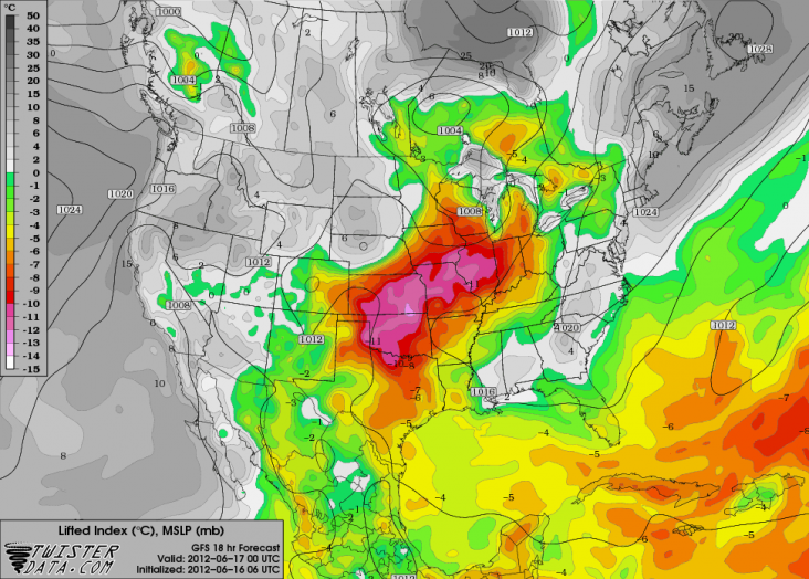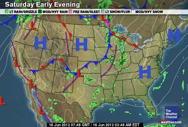 Het vaderdag weekeind zal een stormachtig begin hebben van het Midwesten tot de Central Plains als zware tot zeer zware onweerbuien over de regio trekken. De atmosferische omstandigheden worden in de loop van de dag steeds gunstiger voor de ontwikkeling van deze krachtige onweersbuien. De buien gaan gepaard met windstoten van meer dan 96,5 km/h, hagelstenen zo groot als golfballen en/of honkballen. Ook de mogelijkheid van het ontstaan van een tornado mag niet uitgesloten worden. Tevens zullen door de hevige neerslag gevaarlijke omstandigheden op de wegen ontstaan. Maar het grootste gevaar zal de hoge bliksemactiviteit zijn. In de loop van de nacht is vooral de enorme wind een probleem.